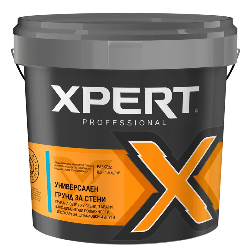 **Универсален грунд за стени Експерт** е водоразредим акрилен грунд, предназначен за подготовка на интериорни и екстериорни повърхности преди нанасяне на латекс, фасадни бои, шпакловки или мазилки. Продуктът прониква дълбоко в основата, като я заздравява и намалява нейната попиваемост.