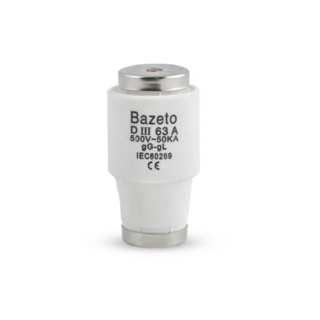 Порцеланов предпазител патрон 63A – керамичен стопяем предпазител за защита на електрически инсталации от претоварване и късо съединение.